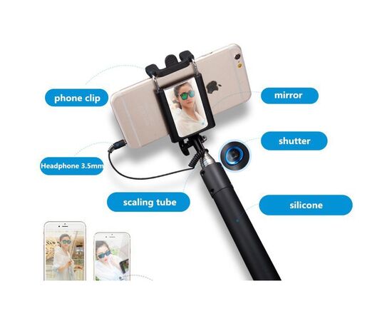 Πτυσόμενο Selfie Stick με ενσύρματο κουμπί φωτογραφίας. Συνδέεται σαν Handsfree στην είσοδο ήχου της συσκευής.