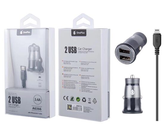 Φορτιστής Αυτοκινήτου με 2x USB 3.4A OnePlus A6366 + Καλώδιο Σύνδεσης Lightning Μαύρο