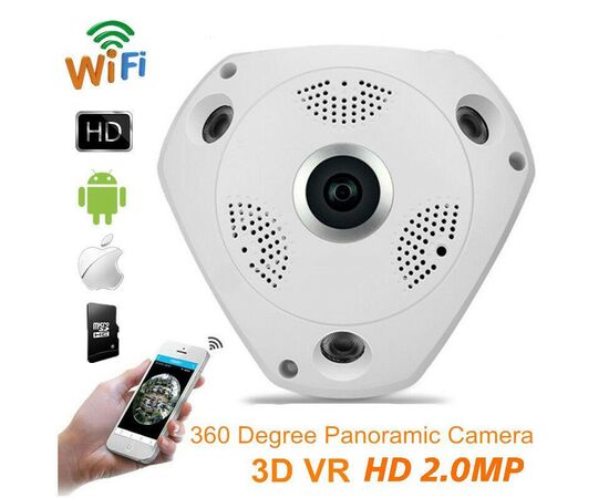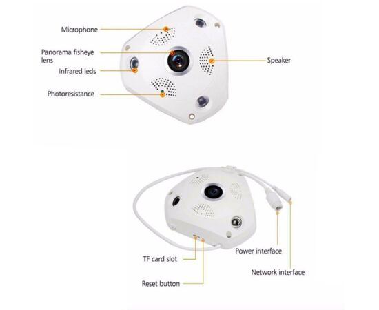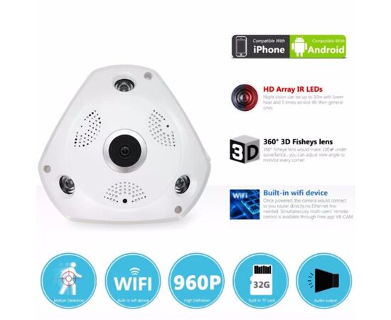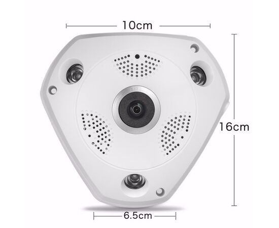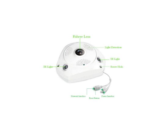 3D παρακολούθηση IR Led : 5-10 μέτρα Power Supply(V):12V Sensor:CMOS Dimensions (L x W x D)(mm):165*155mm Εικόνα εικονικής πραγματικότητας (Virtual reality VR) 360° πανοραμική εικόνα Ηλεκτρονικό PTZ Νυχτερινή όραση Υποστηρίζει εφαρμογή για κινητά (IOS και Android) Υποστηρίζει μέχρι 32GB Micro SD για καταγραφή Type:IP Camera Video Compression Format:H.264 Ανάλυση: 960P HD Image Sensor:1.3Mega Pixel CMOS Frame Rate:25fps VR IP Camera Wireless:1.3MP CCTV IP Camera Network Interface:RJ45 / Wi-Fi.