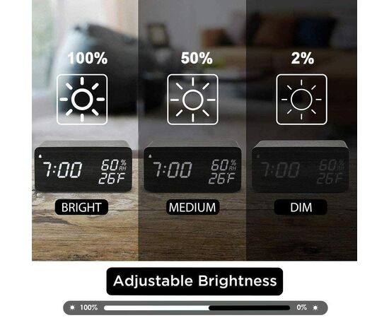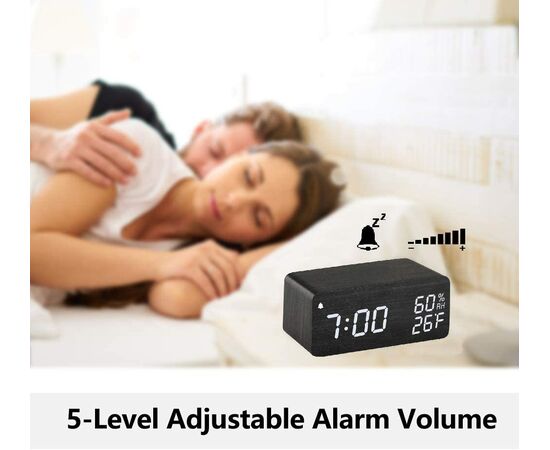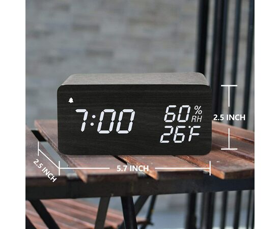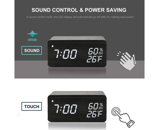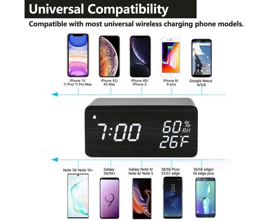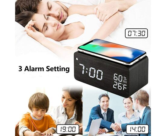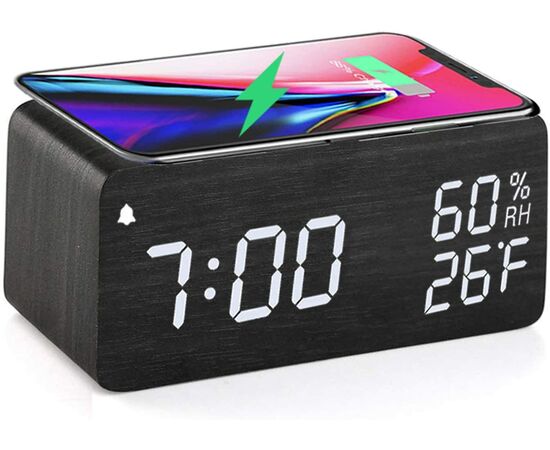 Ξύλινο Επιτραπέζιο Ρολόι με Ξυπνητήρι & Θερμοκρασία​ / Wood Alarm Clock με Ασύρματη Φόρτιση Κινητού 2in1 Μαύρο OEM