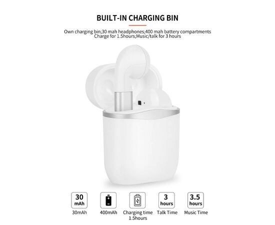 Η μπαταρία 30mAh σε κάθε ακουστικό επιτρέπει 3-4 ώρες χρόνου εργασίας και μπορεί να φορτιστεί αυτόματα στο κουτί φόρτισης 400mAh για 3-4 φορές.